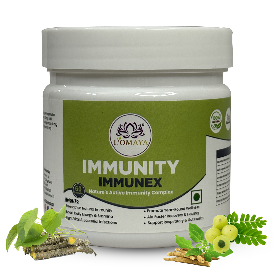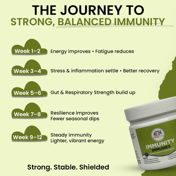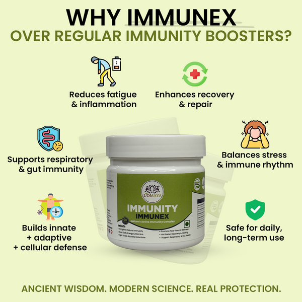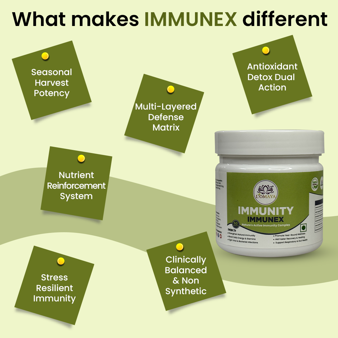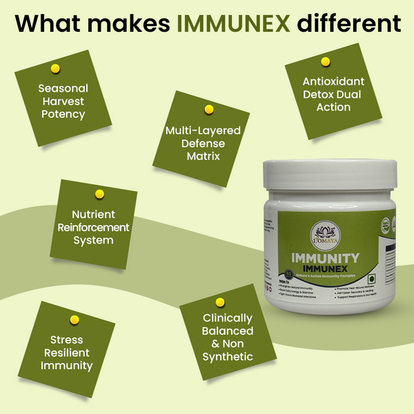 IMMUNEX strengthens the immune system by enhancing the three core defense layers — innate (first response), adaptive (long-term protection), and cellular (regeneration and repair). It works through immune modulation, not overstimulation. By improving gut flora and liver detox activity, it supports immune cell production in the bone marrow and promotes efficient toxin clearance — two vital processes for strong immunity. It also balances cytokine activity to prevent chronic inflammation while maintaining quick pathogen response. In essence, IMMUNEX doesn’t “push” your immunity; it trains and tunes it for consistent, intelligent defense across seasons and stress phases.