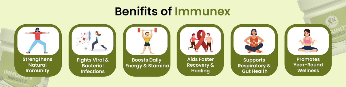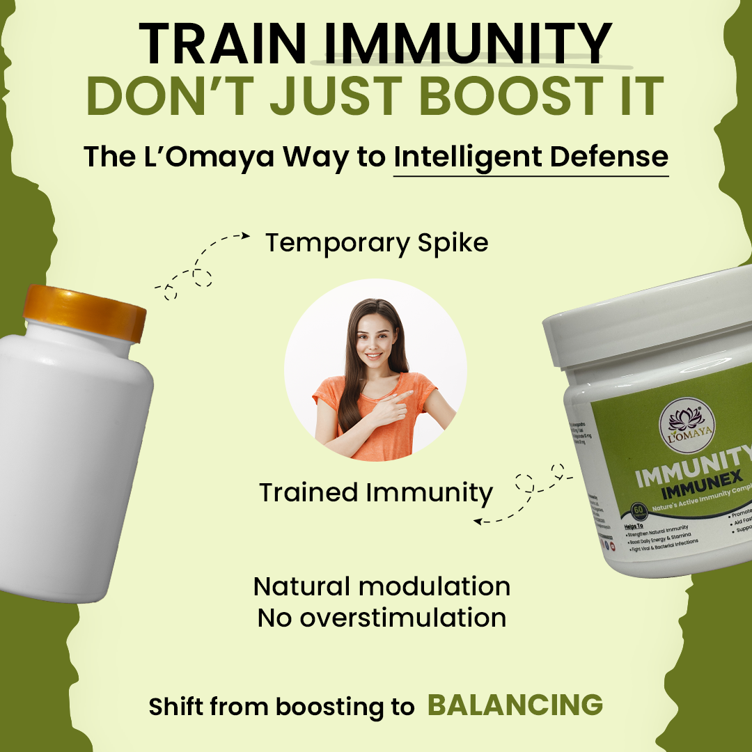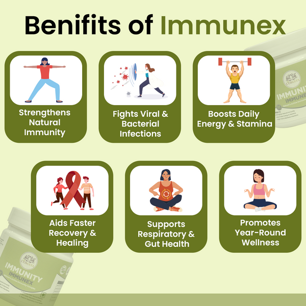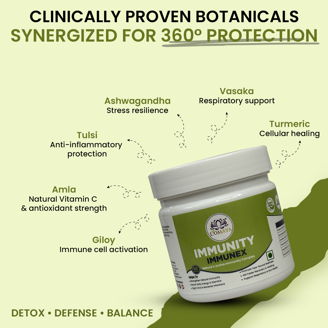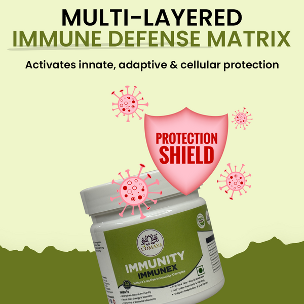 IMMUNEX strengthens the immune system by enhancing the three core defense layers — innate (first response), adaptive (long-term protection), and cellular (regeneration and repair). It works through immune modulation, not overstimulation. By improving gut flora and liver detox activity, it supports immune cell production in the bone marrow and promotes efficient toxin clearance — two vital processes for strong immunity. It also balances cytokine activity to prevent chronic inflammation while maintaining quick pathogen response. In essence, IMMUNEX doesn’t “push” your immunity; it trains and tunes it for consistent, intelligent defense across seasons and stress phases.
