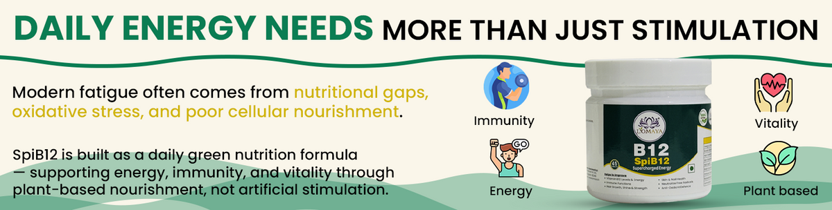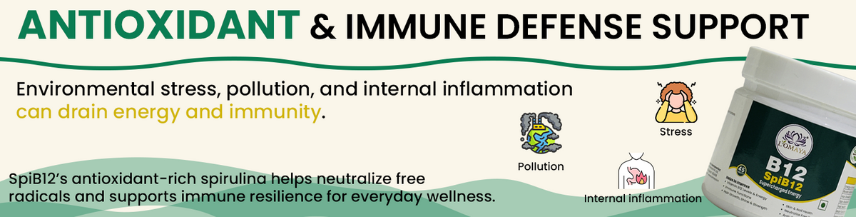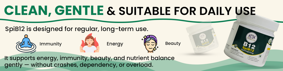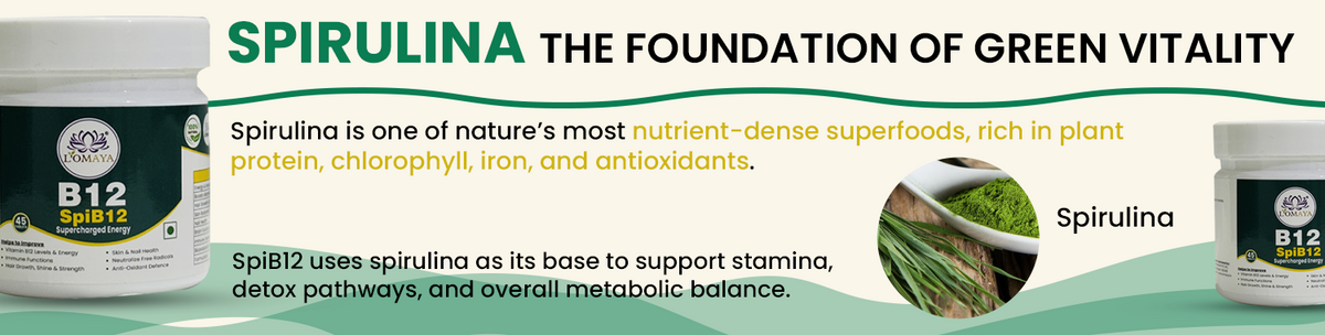 SpiB12 blends Spirulina — a nutrient-dense superfood — with Methylcobalamin (B12), Biotin, and PiperBoost™ to fight B12 deficiency, enhance energy, support metabolism, and promote healthy skin and hair.
