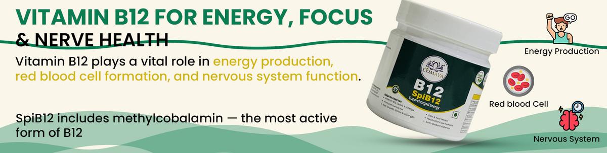 SpiB12 is a unique fusion of Spirulina, Methylcobalamin (Vitamin B12), Biotin, and PiperBoost™. Packed with plant-based proteins, natural vitamins, and minerals, Spirulina makes SpiB12 a powerhouse for energy, stamina, and recovery. It helps correct B12 deficiency while nourishing your body with antioxidant protection and nutrient support. With Biotin for healthy skin and hair, and PiperBoost™ for superior absorption, SpiB12 offers a holistic approach to daily wellness. One capsule a day keeps you naturally energized, radiant, and balanced.