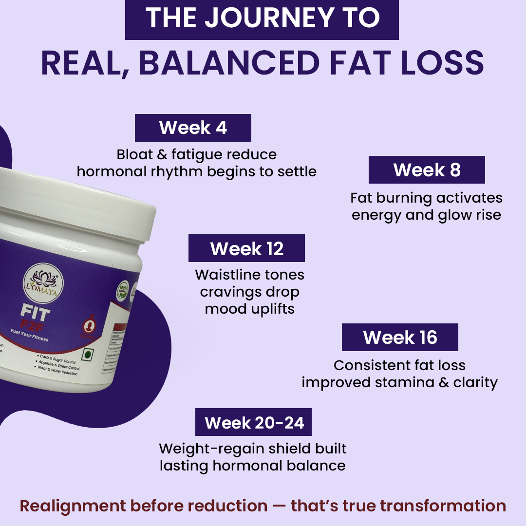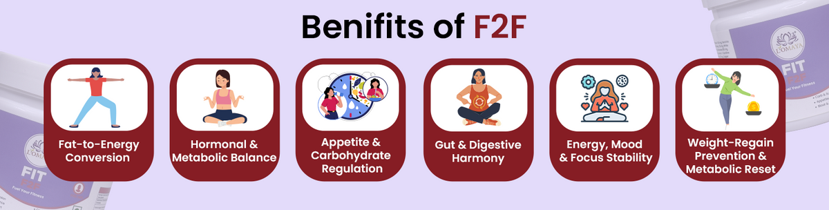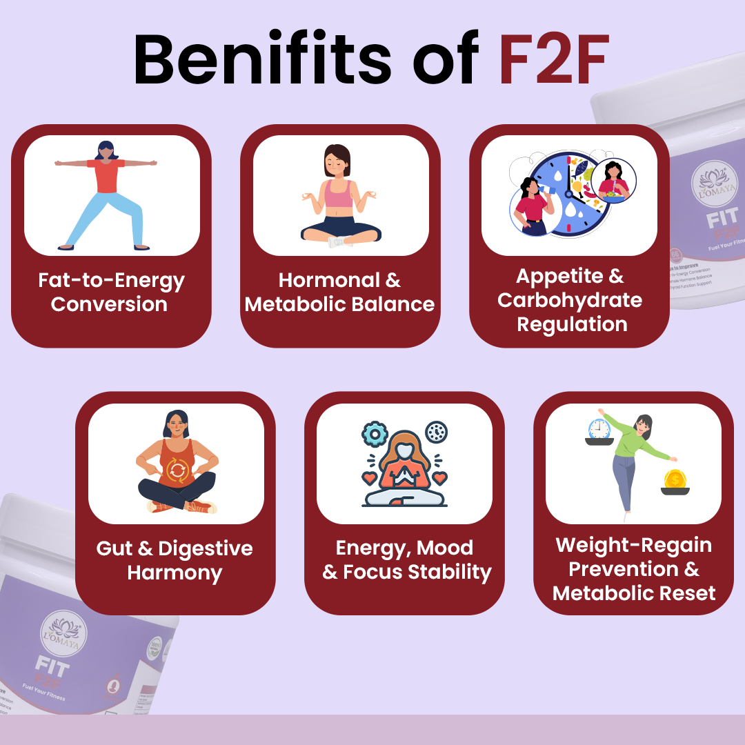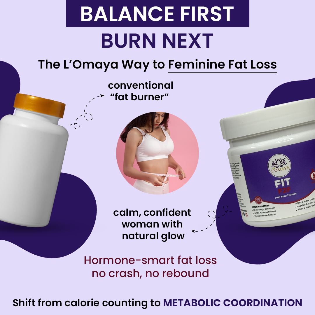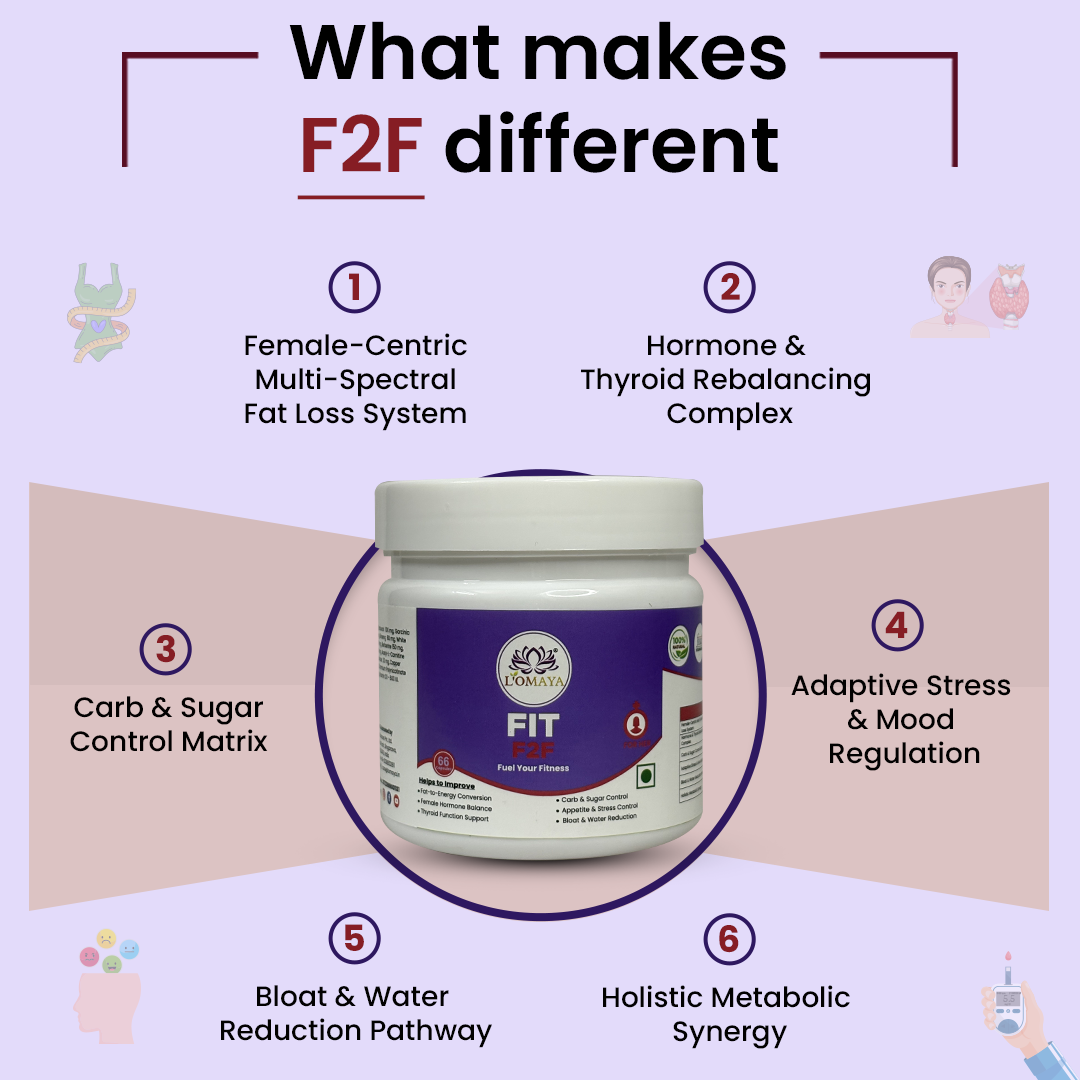 F2F is engineered exclusively for female biology, recognizing that women gain and retain fat differently than men. Factors like hormonal imbalance, thyroid slowdown, emotional stress, and fluid retention often play a bigger role than calorie intake alone. F2F works across multiple dimensions of metabolism — supporting hormonal harmony, digestive efficiency, thyroid rhythm, and fat-to-energy conversion. This creates true metabolic stability rather than temporary weight loss. Unlike quick-fix fat burners, F2F helps the body learn to maintain its lean balance naturally, making results sustainable and regain-proof even after the course is complete.