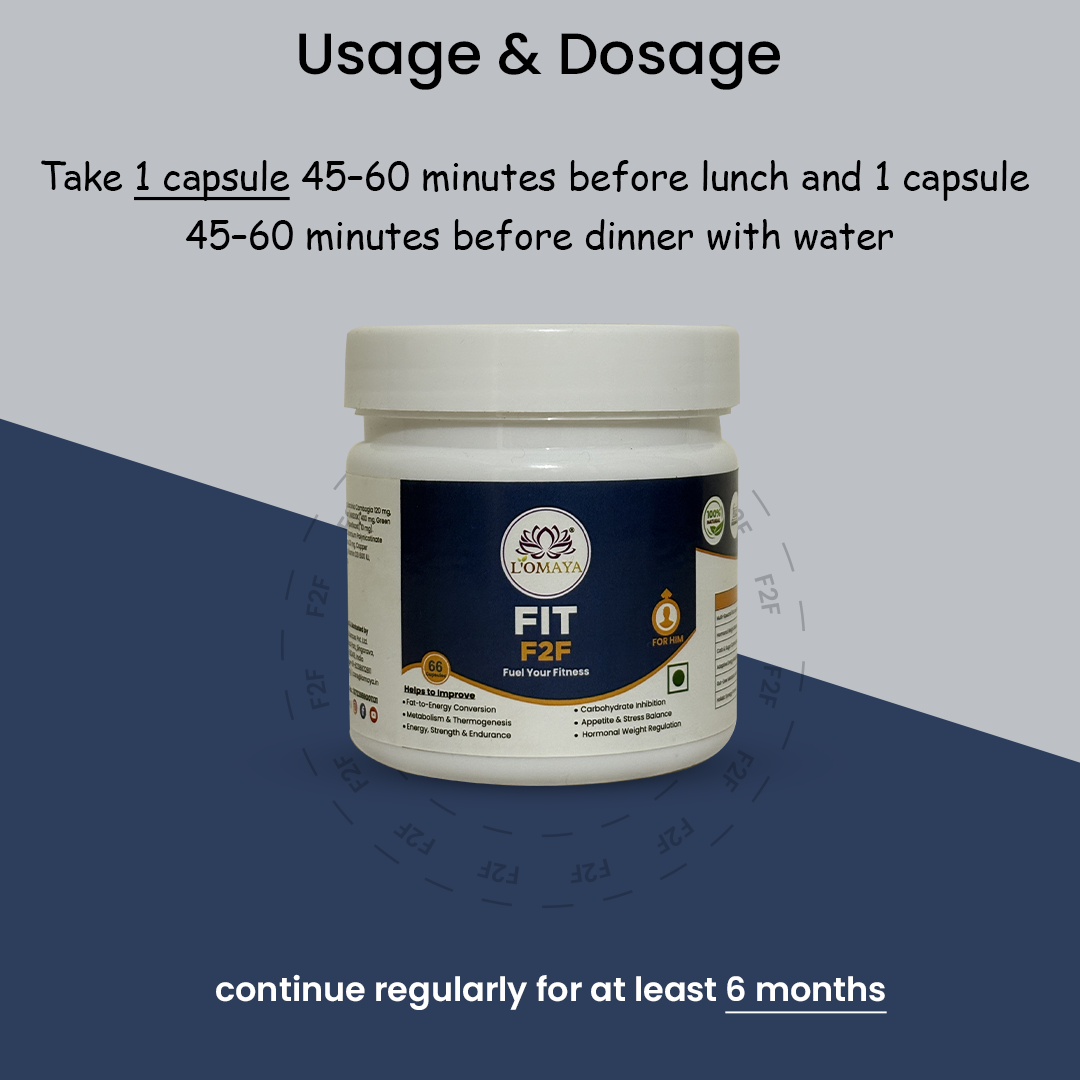 Take one capsule 45–60 minutes before your main meal (e.g., lunch) and one before dinner with water. Use consistently every day for at least 3–6 months to allow your metabolism and hormone systems to adapt and maintain the leaner state long-term.